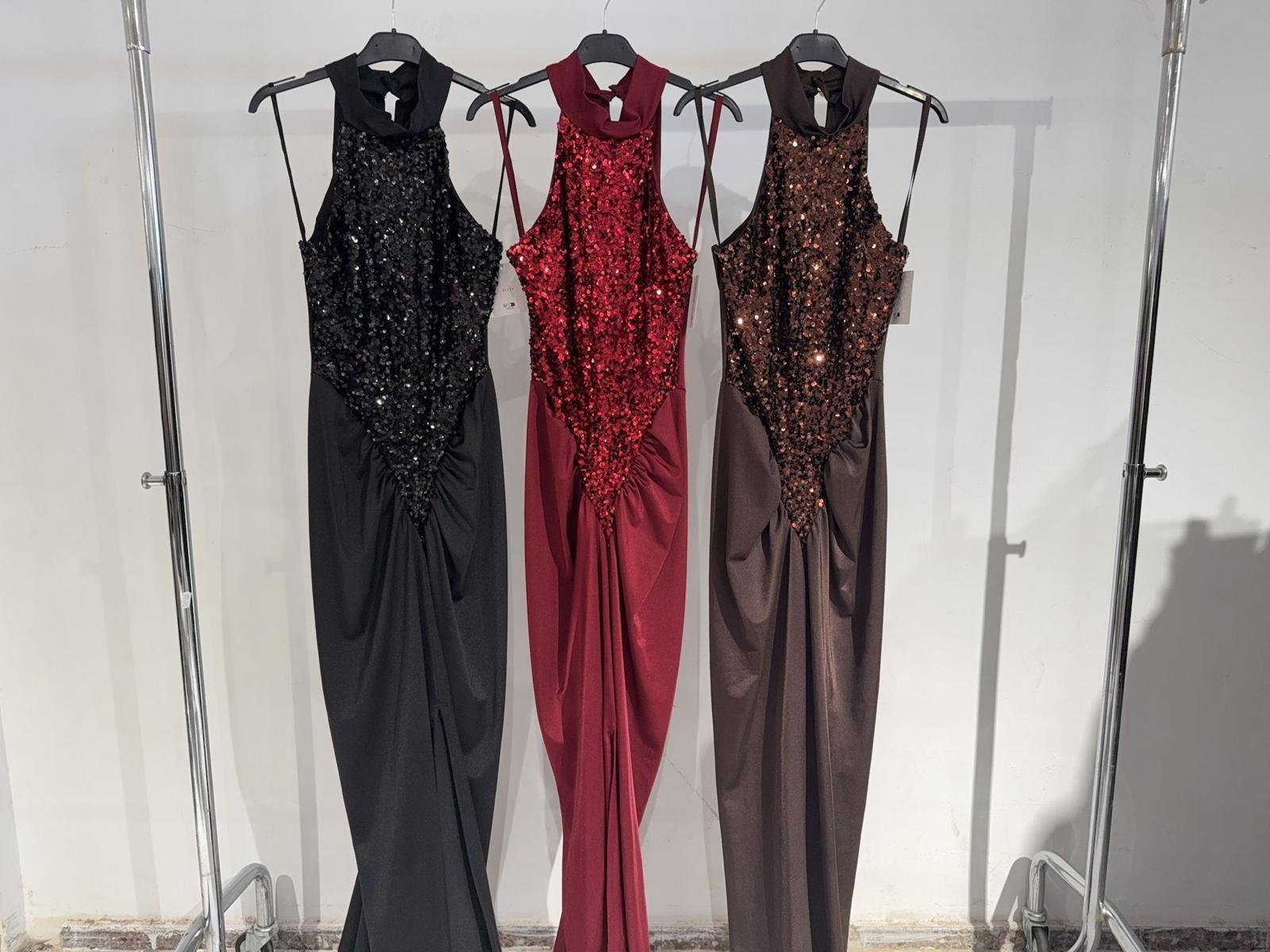 Vestido largo con detalle de lentejuelas, fruncido, talla única de la XS hasta la L aproximadamente.