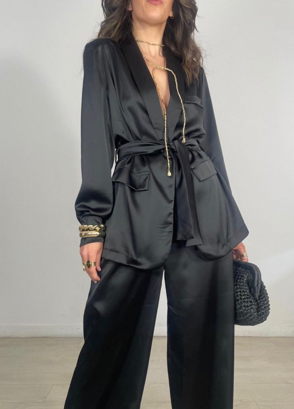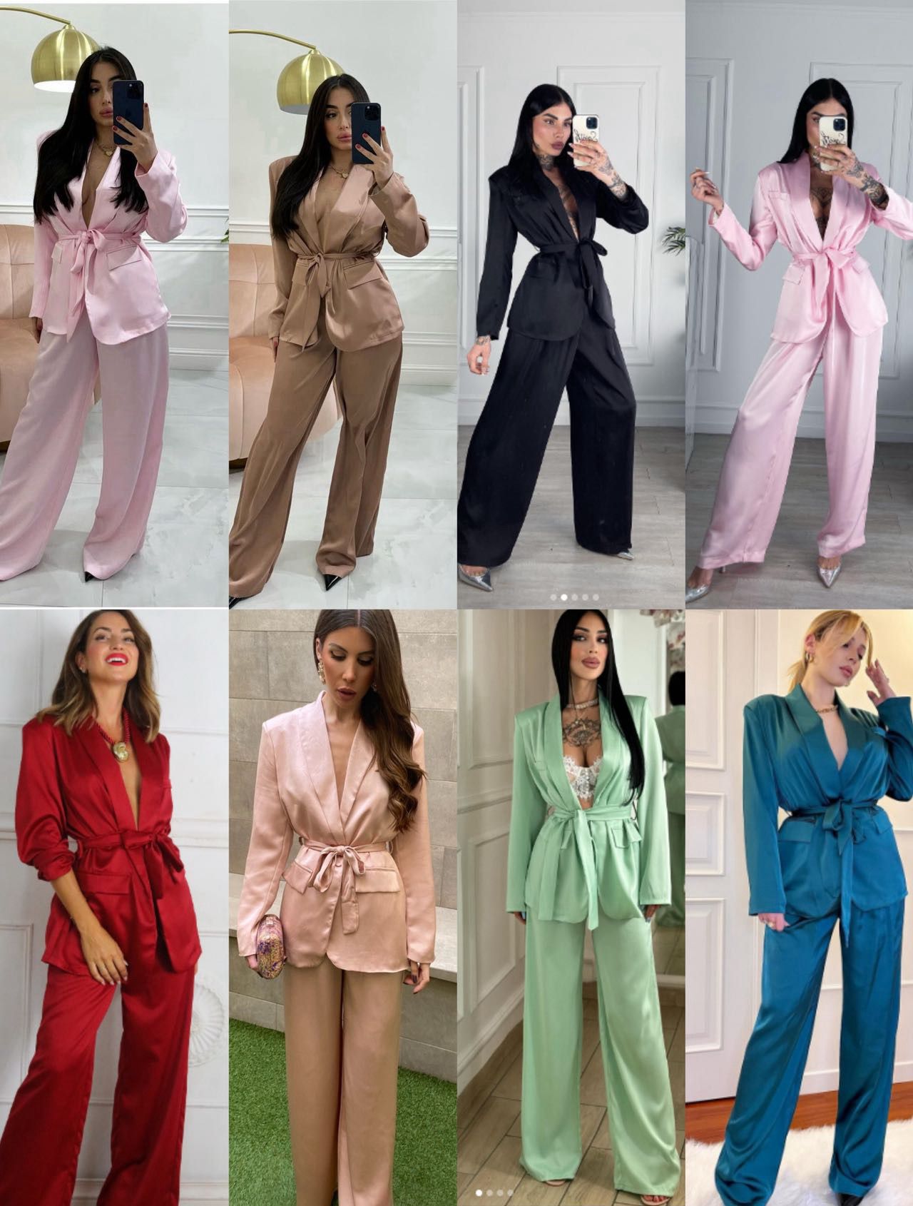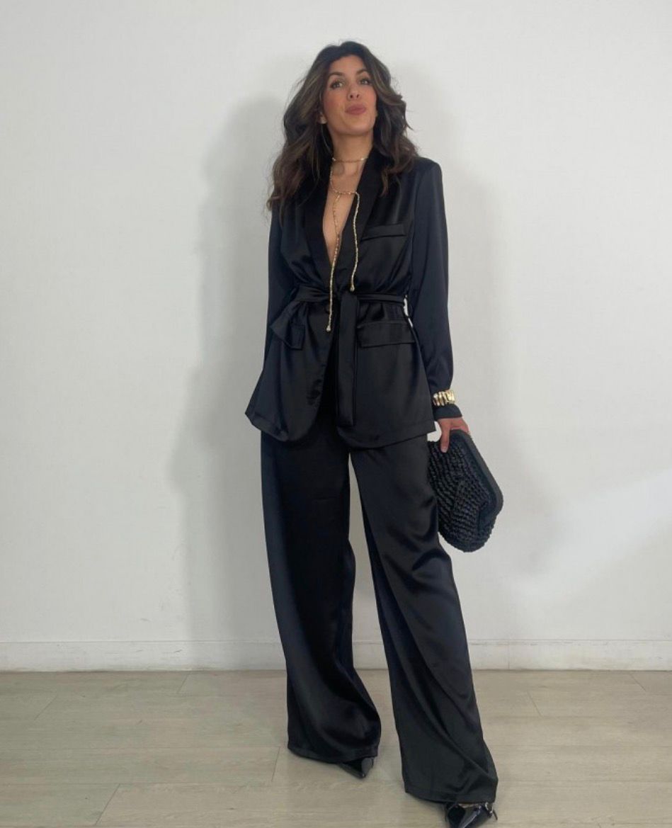 Conjunto satinado, con cinturon, viene por tallas desde la XS hasta la XL aproximadamente.